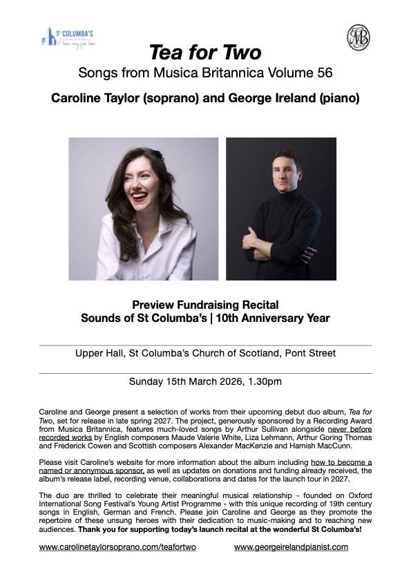 In March 2026, Caroline and duo partner George Ireland embark on the exciting journey of releasing a debut duo album, Tea for Two, celebrating unheard 19th century songs by English and Scottish composers from the Musica Britannica collection.